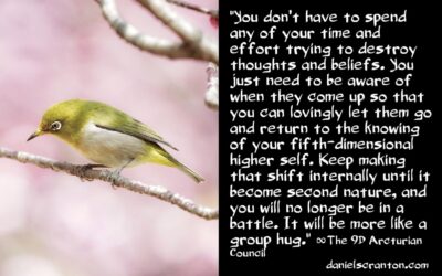 You don’t have to spend any of your time and effort trying to destroy thoughts and beliefs. You just need to be aware of when they come up so that you can lovingly let them go and return to the knowing of your fifth-dimensional higher self. Keep making that shift internally until it become second nature, and you will no longer be in a battle. It will be more like a group hug.