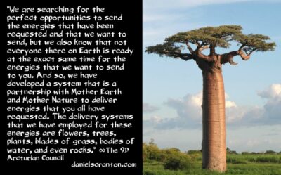 We are searching for the perfect opportunities to send the energies that have been requested and that we want to send, but we also know that not everyone there on Earth is ready at the exact same time for the energies that we want to send to you. And so, we have developed a system that is a partnership with Mother Earth and Mother Nature to deliver energies that you all have requested. The delivery systems that we have employed for these energies are flowers, trees, plants, blades of grass, bodies of water, and even rocks.