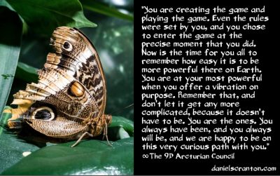 You are creating the game and playing the game. Even the rules were set by you, and you chose to enter the game at the precise moment that you did. Now is the time for you all to remember how easy it is to be more powerful there on Earth. You are at your most powerful when you offer a vibration on purpose. Remember that, and don’t let it get any more complicated, because it doesn’t have to be. You are the ones. You always have been, and you always will be, and we are happy to be on this very curious path with you.