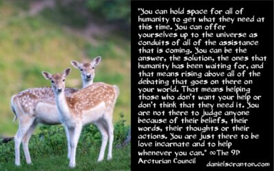 And so, you can hold space for all of humanity to get what they need at this time. You can offer yourselves up to the universe as conduits of all of the assistance that is coming. You can be the answer, the solution, the ones that humanity has been waiting for, and that means rising above all of the debating that goes on there on your world. That means helping those who don’t want your help or don’t think that they need it. You are not there to judge anyone because of their beliefs, their words, their thoughts or their actions. You are just there to be love incarnate and to help whenever you can.