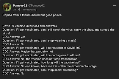 The Covd-19 vaccine does not provide immunity, does not eliminate the virus, does not prevent death, does not guarantee you won’t get it, does not stop you from passing it on to others, does not eliminate wearing masks or social distancing, does not eliminate lock downs, and if you have a death or adverse effects, you are out of luck.