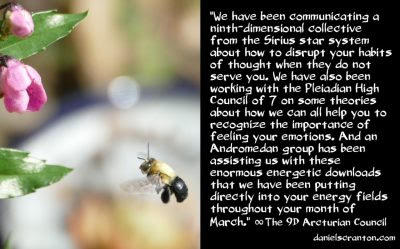 We have been communicating with a ninth-dimensional collective from the Sirius star system about how to disrupt your habits of thought when they do not serve you. We have also been working with the Pleiadian High Council of 7 on some theories about how we can all help you to recognize the importance of feeling your emotions. And an Andromedan group has been assisting us with these enormous energetic downloads that we have been putting directly into your energy fields throughout your month of March.