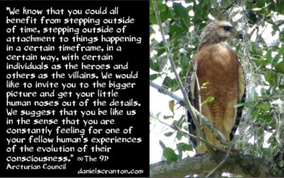 We know that you could all benefit from taking a page out of our book, however. We know that you could all benefit from stepping outside of time, stepping outside of attachment to things happening in a certain timeframe, in a certain way, with certain individuals as the heroes and others as the villains. We would like to invite you to the bigger picture and get your little human noses out of the details. We suggest that you be like us in the sense that you are constantly feeling for one of your fellow human’s experiences of the evolution of their consciousness.