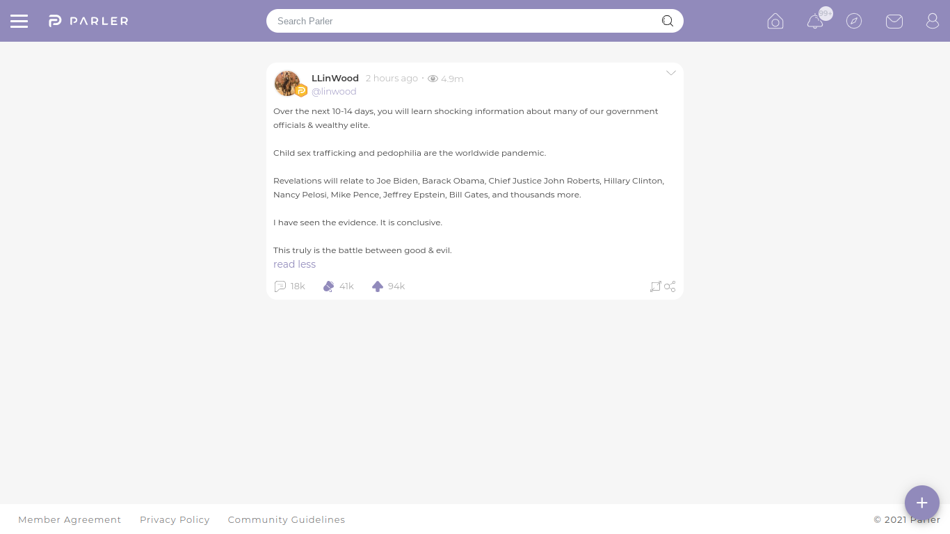 Over the next 10-14 days, you will learn shocking information about many of our government officials & wealthy elite. Child sex trafficking and pedophilia are the worldwide pandemic. Revelations will relate to Joe Biden, Barack Obama, Chief Justice John Roberts, Hillary Clinton, Nancy Pelosi, Mike Pence, Jeffrey Epstein, Bill Gates, and thousands more. I have seen the evidence. It is conclusive. This truly is the battle between good & evil.