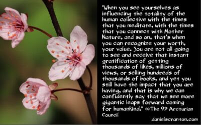 When you see yourselves as influencing the totality of the human collective with the times you meditate, with the times that you connect with Mother Nature, and so on, that’s when you can recognize your worth, your value. You are not all going to see and receive that instant gratification of getting thousands of likes, millions of views, or selling hundreds of thousands of books, and yet you still have the impact that you are having, and that is why we can confidently say that we see more gigantic leaps forward coming for humankind. It is because of each individual part of the collective and what you are doing as individuals.