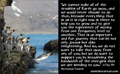 We cannot make all of the troubles of Earth go away, and we would never choose to do that, because everything that is as it is right now is there to help you to grow and to give you the experience of moving from one frequency level to another. That is an important and fun journey that can be not only joyous but also enlightening. And so, we do not want to take that away from any of you, but we do want to support you by broadening the bandwidth of the energies that we are sending to you so you feel that your energy field is bigger and more dominant than what you are being bombarded with all the time.