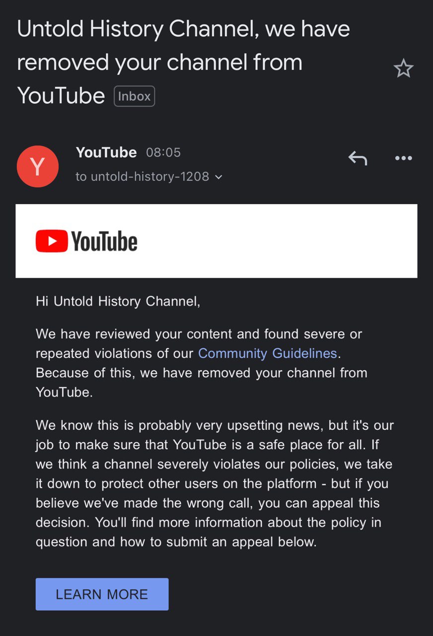 Message from Scott McKay on Telegram ( at 11.22 AM, EST Jan 19, 2021) on Untold History Channel Termination by YouTube.