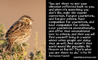 You are there to see your vibration reflected back to you, and when it’s something you don’t like, make the course correction. Forgive yourselves, and forgive others. Have compassion for yourselves, and have compassion for others. Love yourselves unconditionally, and offer that unconditional love to others, and then you will find yourself living in a world where other people are doing that as well. And doesn’t that world sound like paradise, like Heaven on Earth? That’s what you are there to do.