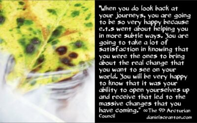 But when you do look back at your journeys, you are going to be so very happy because E.T.s went about helping you in more subtle ways. You are going to take a lot of satisfaction in knowing that you were the ones to bring about the real change that you want to see on your world. You will be very happy to know that it was your ability to open yourselves up and receive that led to the massive changes that you have coming.