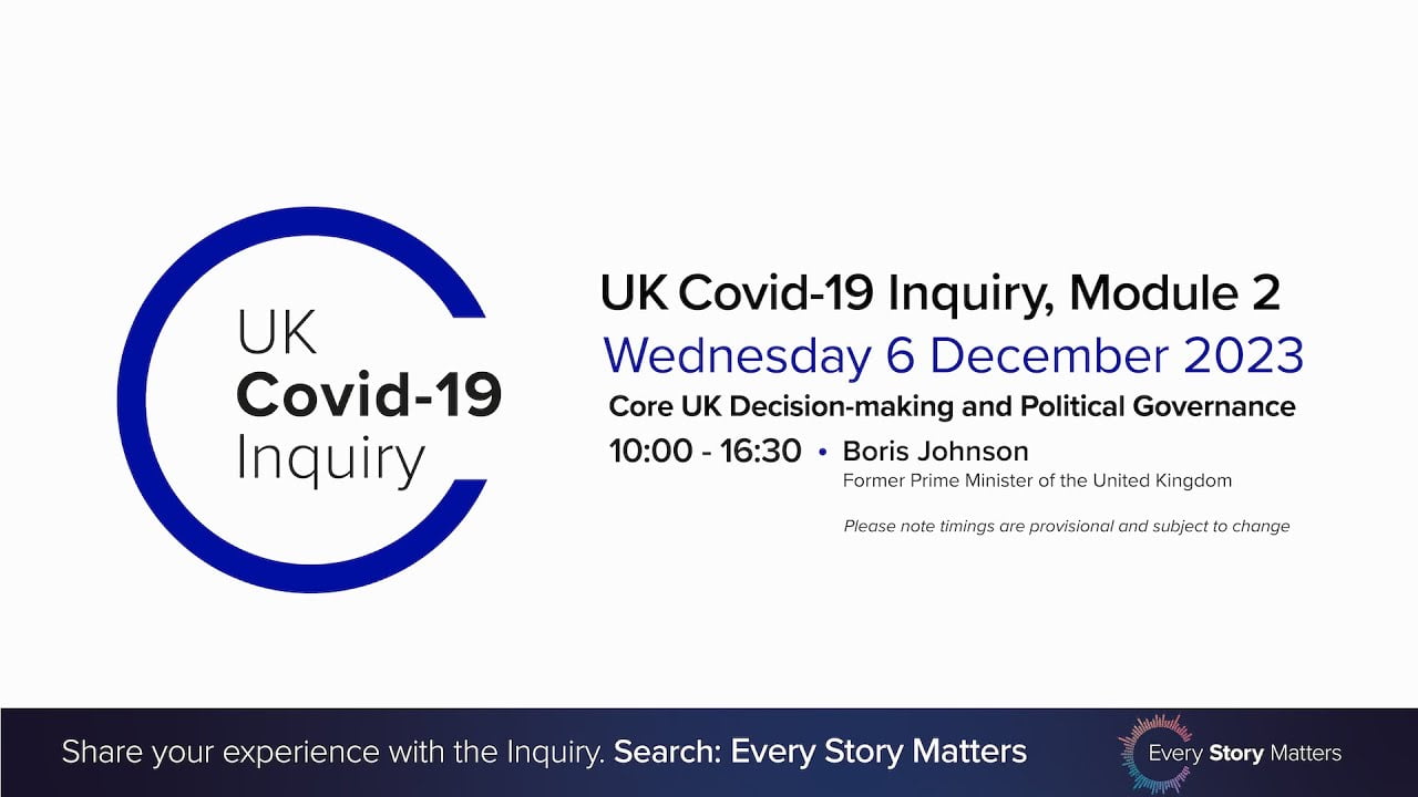 UK Covid-19 Inquiry: Public Hearings – Module 2 (Core UK decision-making and political governance) – Testimony of Boris Johnson (the former PM of the UK) | Week 8 – Wed, Dec 6 and Thu, Dec 7, 2023
