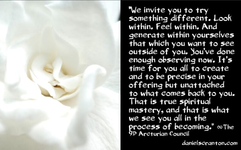 And so, all we can say to you is that we invite you to try something different. Look within. Feel within. And generate within yourselves that which you want to see outside of you. You’ve done enough observing now. It’s time for you all to create and to be precise in your offering but unattached to what comes back to you. That is true spiritual mastery, and that is what we see you all in the process of becoming.