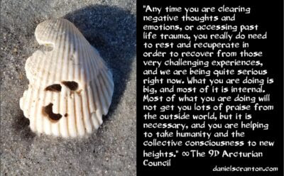 Any time you are clearing negative thoughts and emotions, or accessing past life trauma, you really do need to rest and recuperate in order to recover from those very challenging experiences, and we are being quite serious right now. What you are doing is big, and most of it is internal. Most of what you are doing will not get you lots of praise from the outside world, but it is necessary, and you are helping to take humanity and the collective consciousness to new heights so that you can all have new experiences.