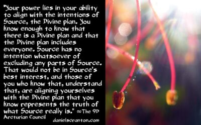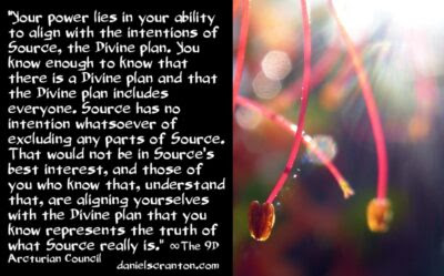 So you will be more likely to go within. You will be more likely to raise your vibration. You will be more likely to forgive and to have compassion than to condemn and to judge. That is where your power lies. Your power lies in your ability to align with the intentions of Source, the Divine plan. You know enough to know that there is a Divine plan and that the Divine plan includes everyone. Source has no intention whatsoever of excluding any parts of Source. That would not be in Source’s best interest, and those of you who know that, understand that, are aligning yourselves with the Divine plan that you know represents the truth of what Source really is.