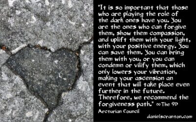 That’s why it is so important that those who are playing the role of the dark ones have you. You are the ones who can forgive them, show them compassion, and uplift them with your light, with your positive energy. You can save them. You can bring them with you, or you can condemn or vilify them, which only lowers your vibration, making your ascension an event that will take place even further in the future. Therefore, we recommend the forgiveness path, because we know that you all want to ascend, and you all want to ascend quickly.