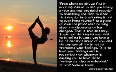 However, from where we sit, we find it more impressive to see you having a true and real emotional reaction to something and then to clear that emotion by processing it and to even bring yourself to a place of calm and peace while nothing about the circumstance has changed. That is true mastery. Those are the stories you need to be telling because you have a lot of emotions inside of you, and the purpose of life is not to transcend your feelings. It is to have your feelings and to recognize that whatever is causing you to have those feelings can also be embraced.