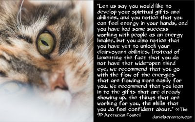 Let us say you would like to develop your spiritual gifts and abilities, and you notice that you can feel energy in your hands, and you have had some success working with people as an energy healer, but you also notice that you have yet to unlock your clairvoyant abilities. Instead of lamenting the fact that you do not have that wide-open third eye, we recommend that you go with the flow of the energies that are flowing more easily for you. We recommend that you lean in to the gifts that are already showing up, the things that are working for you, the skills that you do feel confident about.