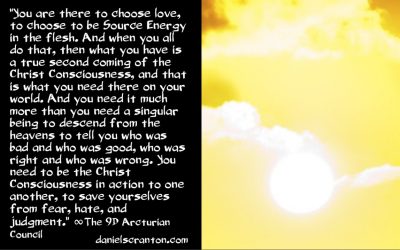 You are there to choose love, to choose to be Source Energy in the flesh. And when you all do that, then what you have is a true second coming of the Christ Consciousness, and that is what you need there on your world. And you need it much more than you need a singular being to descend from the heavens to tell you who was bad and who was good, who was right and who was wrong. You need to be the Christ Consciousness in action to one another, to save yourselves from fear, hate, and judgment, because those states of being, when allowed to fester inside of you, create a toxic environment, one that makes it more difficult to love thy neighbor.