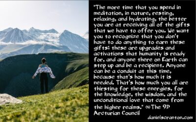 The more time you spend in meditation, in nature, resting, relaxing, and hydrating, the better you are receiving all of the gifts that we have to offer you. We want you to recognize that you don’t have to do anything to earn these gifts; these are upgrades and activations that humanity is ready for, and anyone there on Earth can step up and be a recipient. Anyone can be a conduit at this time, because that’s how much it is needed. That’s how much you all are thirsting for these energies, for the knowledge, the wisdom, and the unconditional love that come from the higher realms and that continue to bombard you all the time.