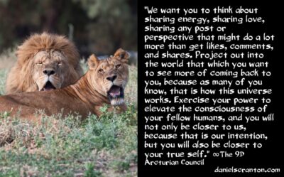 We want you to think about sharing energy, sharing love, sharing any post or perspective that might do a lot more than get likes, comments, and shares. Project out into the world that which you want to see more of coming back to you, because as many of you know, that is how this universe works. Exercise your power to elevate the consciousness of your fellow humans, and you will not only be closer to us, because that is our intention, but you will also be closer to your true self.